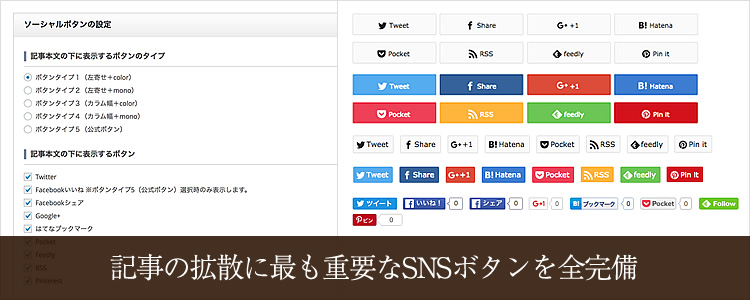 表示させるボタンも任意で選択して頂けるようになっています。とくにソーシャルとの連携が必要ないサイトであればあえて非表示にする方もいます。
